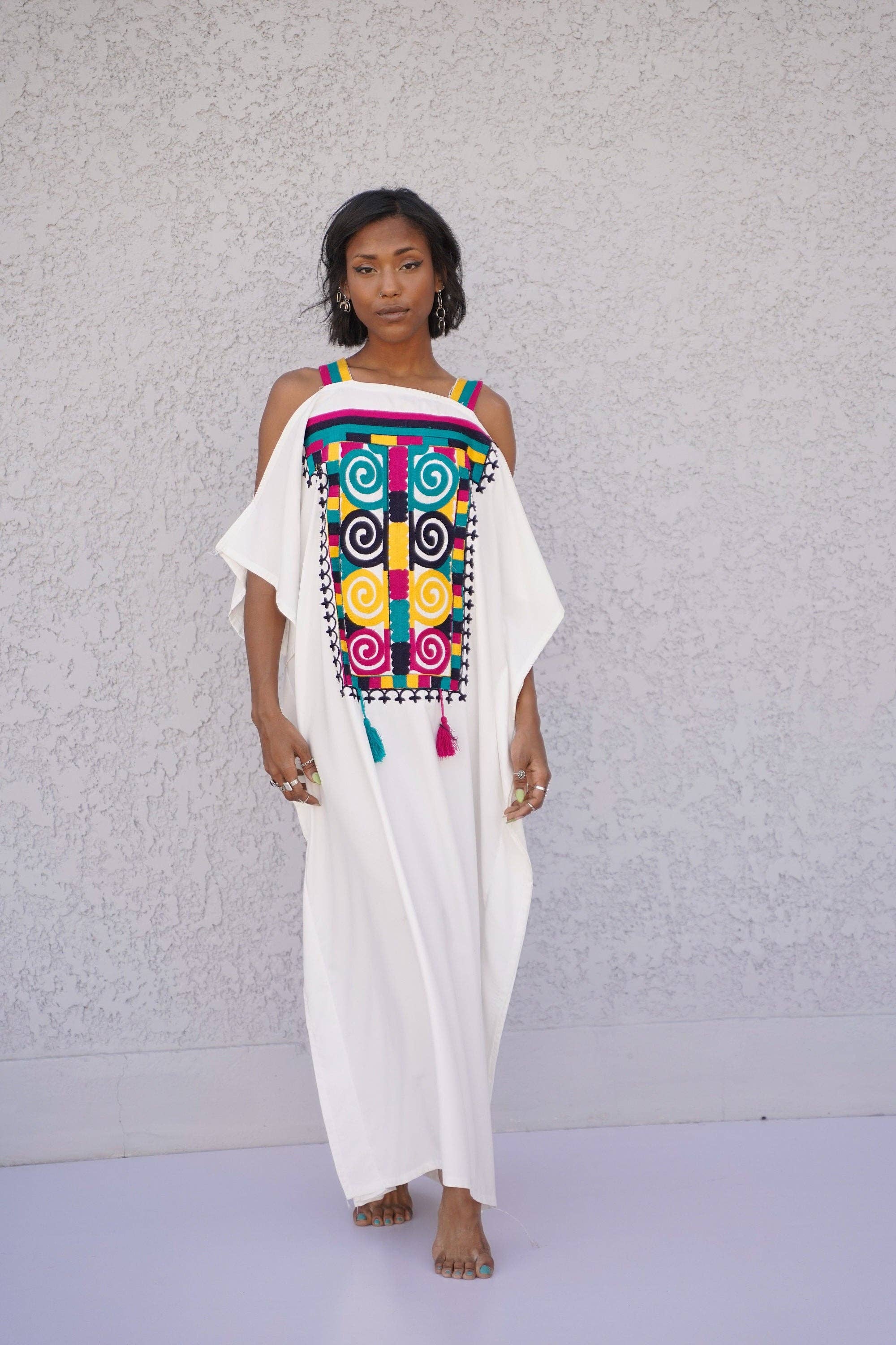 White Colourful Embroidered Cotton Kaftan: Size Medium