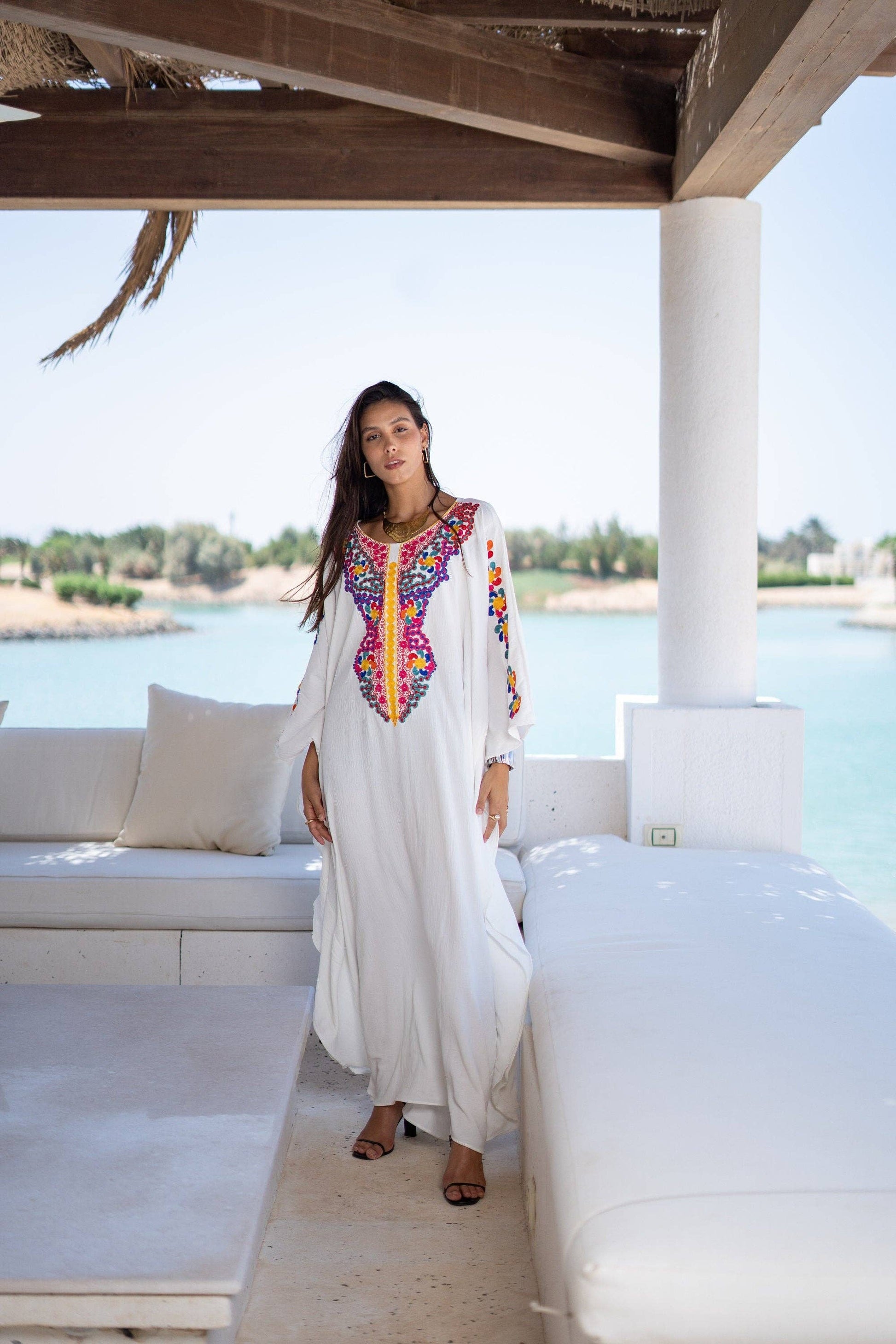 Stunning kaftan maxi dress with beautiful embroidery is made of extremely soft Egyptian Linen.