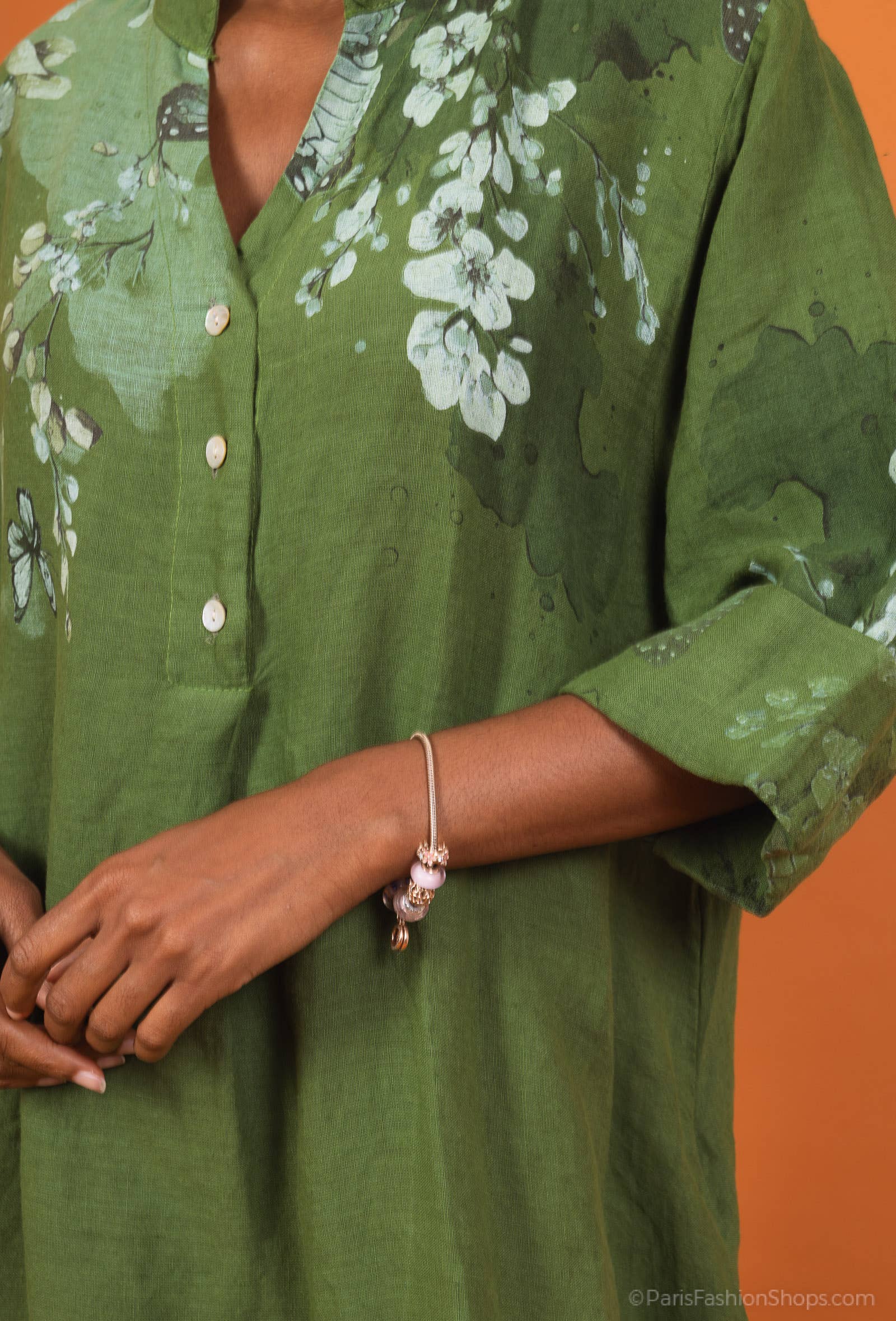 Meet your new go-to dress—a relaxed linen piece that's perfect for those days when you want to look put-together without trying too hard. Made from 100% linen, this olive dress features a sweet butterfly print that's placed just right, giving it a bit of personality without being over the top. You'll love the three buttons on the collar for a classic touch, plus two handy pockets because who doesn't appreciate somewhere to stash their phone or keys? The long sleeves keep things comfortable whether you're dealing with summer sun or cooler weather, and the natural linen fabric breathes beautifully so you stay cool all day long. One size fits most, making it an easy grab-and-go option for your wardrobe. Throw it on with sneakers for a casual vibe or dress it up with sandals and jewellery for something a bit more polished. This is the kind of dress that becomes a summer staple you'll reach for again and again.