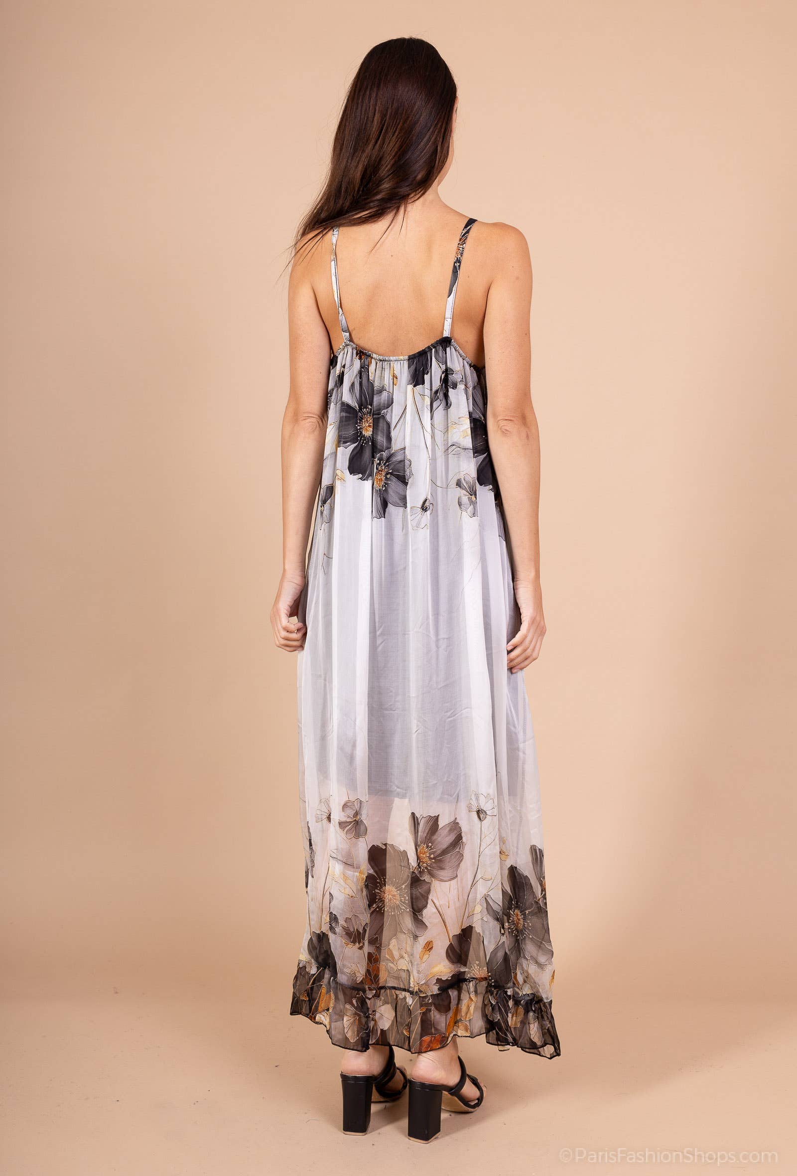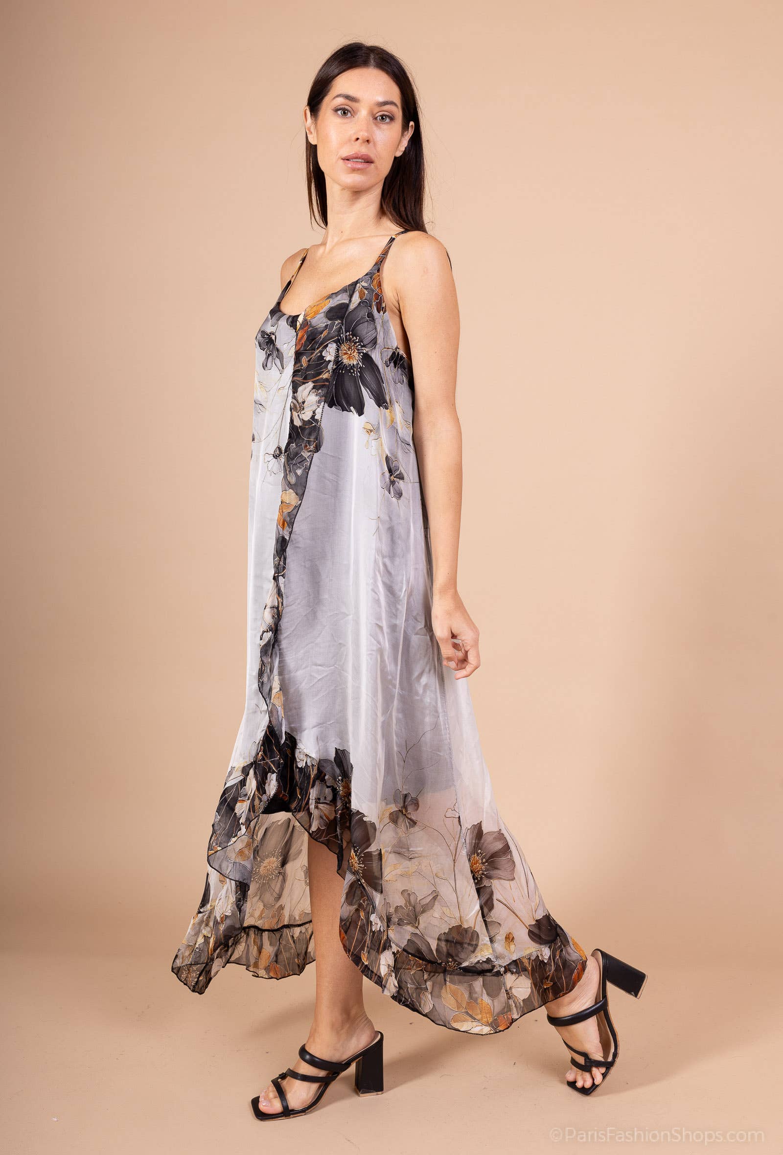 Elevate your wardrobe with this stunning floral ruffled silk dress, a versatile piece that effortlessly transitions from day to night. Crafted from a luxurious blend of 30% silk and 70% viscose, this dress offers the perfect balance of comfort and elegance. The delicate floral pattern paired with romantic ruffled detailing creates visual interest and movement, while the thin straps provide a flattering, feminine silhouette. The timeless black hue ensures it pairs beautifully with any accessory, making it an essential addition to your collection. One size fits most, designed to drape gracefully on various body types. Whether you're dressing up for a special occasion or seeking an elevated everyday look, this dress delivers sophistication and charm in equal measure.