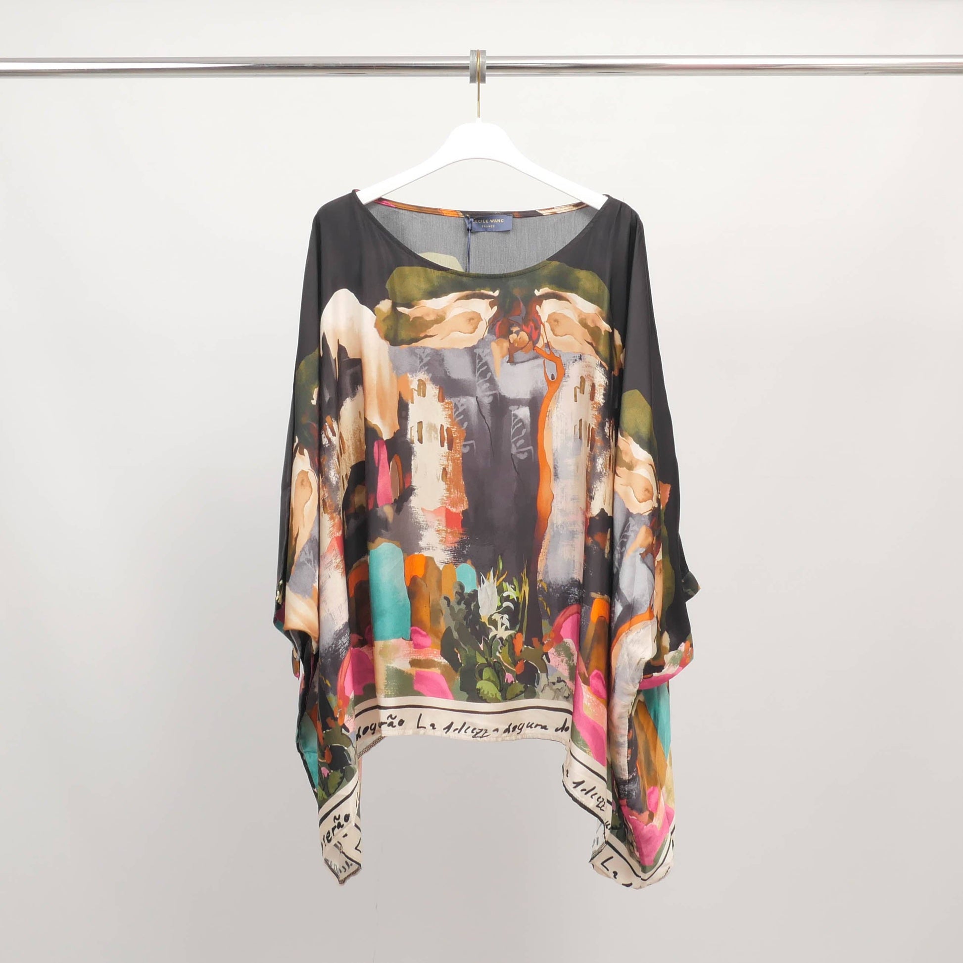 A piece at the crossroads of fashion and art. This fluid tunic captivates with its pictorial print reminiscent of an abstract canvas, enhanced with vibrant touches and a poetic handwritten message along the edge. Its ample volume and asymmetrical cut offer absolute freedom of movement, while the silky fabric lightly caresses the skin. The boat neckline highlights the shoulder line for an elegant drape, regardless of body shape. Wear it as a fluid top with fitted pants or belted over a swimsuit for a refined beach look.
