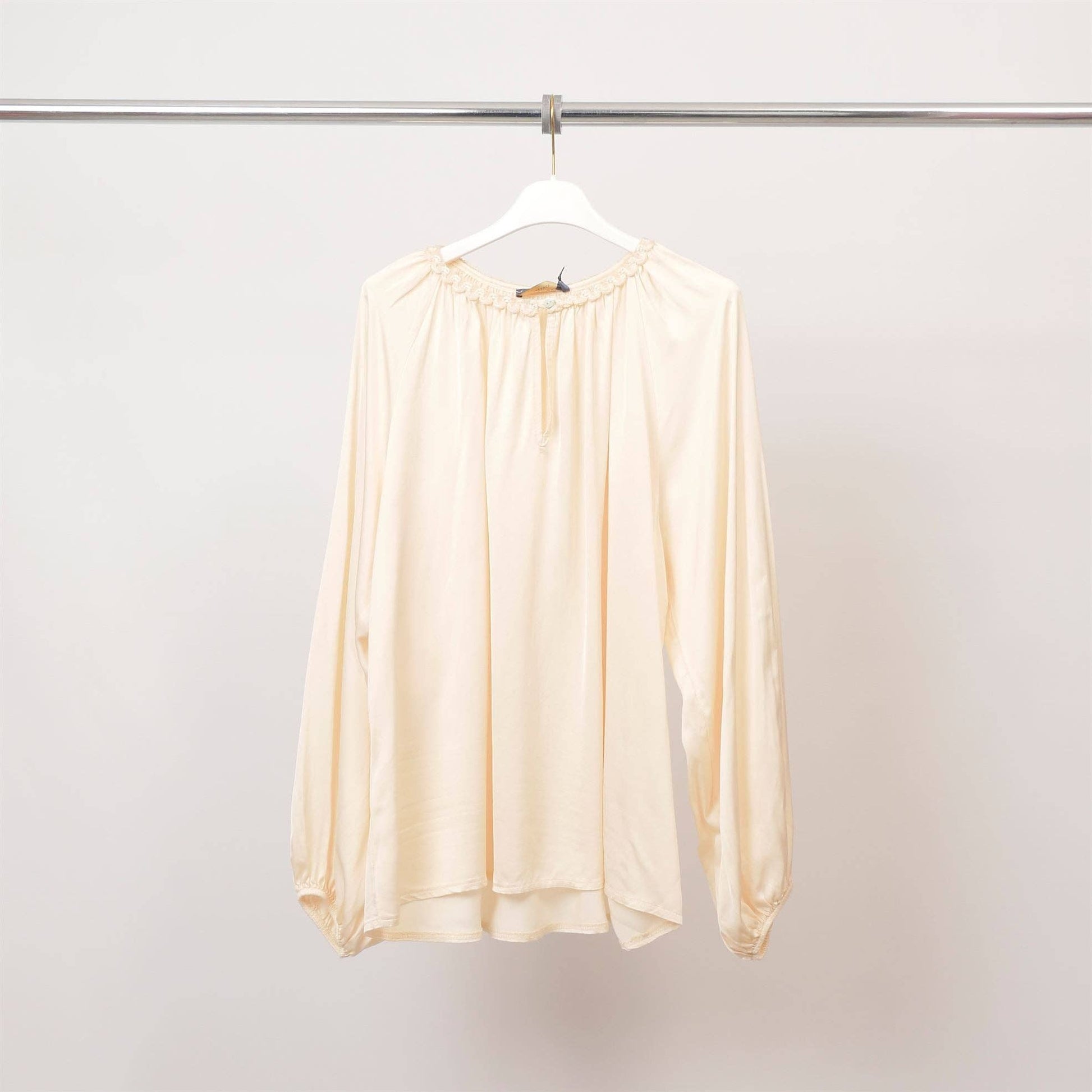 Its long sleeves are slightly puffed and cinched at the wrists, creating a lovely volume, while its loose fit ensures an elegant and comfortable drape.