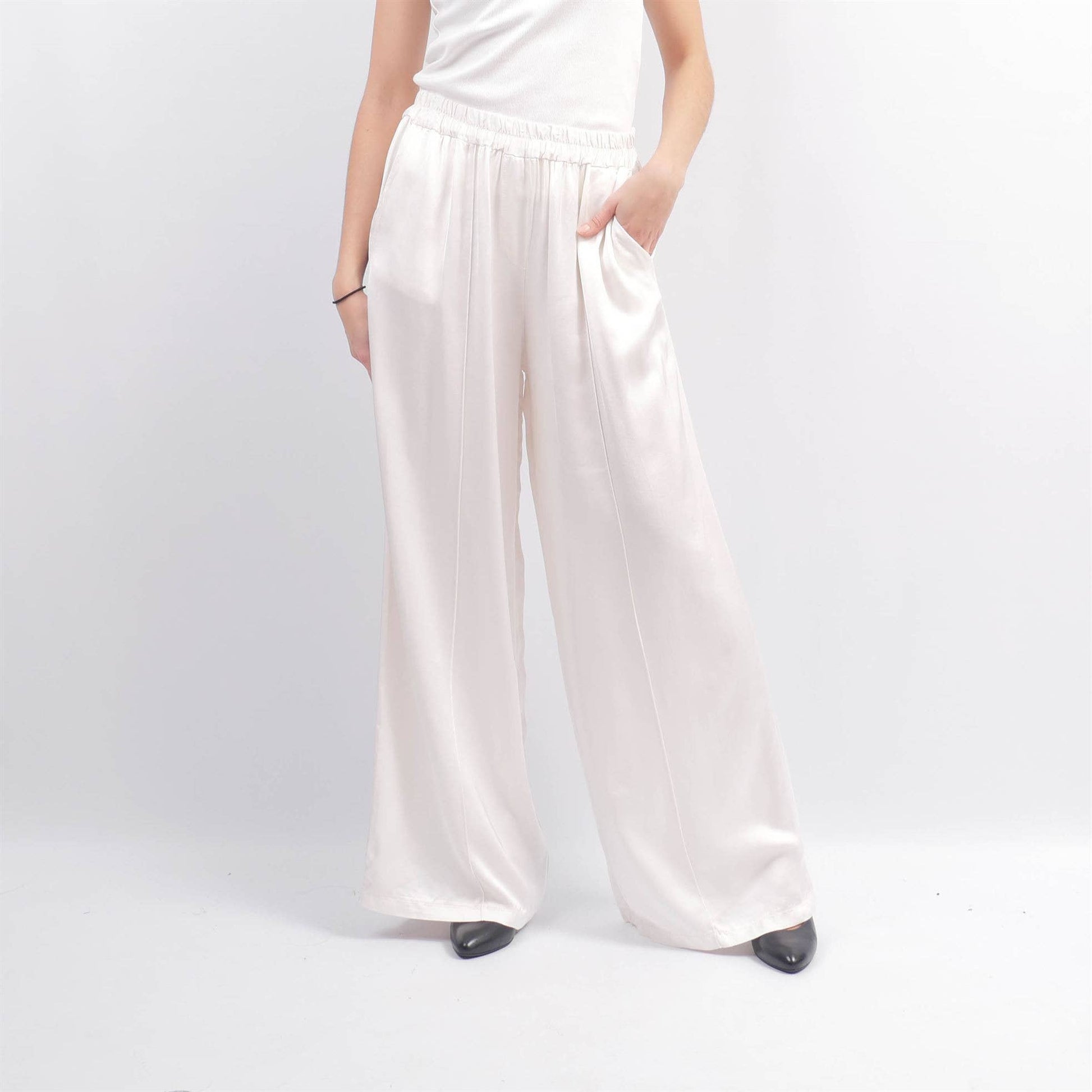 Elevate your wardrobe with these luxurious wide pants crafted from premium satin viscose. The sumptuous blend of 98% viscose and 2% silk creates an exquisite drape that moves with effortless sophistication. The generous wide-leg silhouette offers contemporary elegance while providing exceptional comfort for all-day wear. The lustrous finish catches light beautifully, making these pants a versatile foundation piece that transitions seamlessly from refined daywear to evening occasions. Perfect for those who appreciate quality fabrics and timeless design.